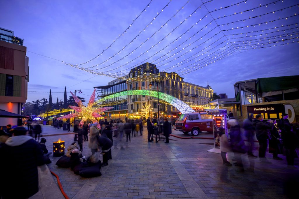 Planets, colourful galaxies and stars lit up Rustaveli Avenue, going up to Freedom Square, where a fall of coloured satellites embraced the impressive obelisk, landmark of the square.