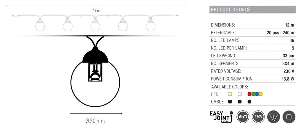 To welcome the fine weather, you’ll be entitled to an extra 30% discount* on this item, for all orders placed within June 20th,2020. In order to take advantage of this promotion you can apply the discount code “PARTYLIGHTS30” during checkout on our E-Commerce or contact our offices to have further information and place an order.