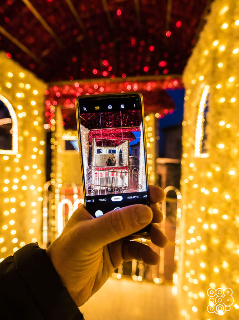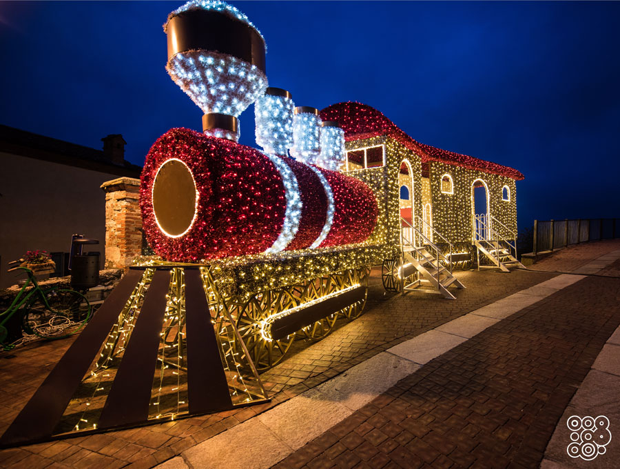 On the cover ZHUG 800 the walk-through train with its 8-meter-long crossable tunnel, completely covered with mirrored gold and silver limited garlands, with an infinity of LEDs, all decorated with a Led Rope Light that draws and defines the motif and gold-colored inserts is a real show.