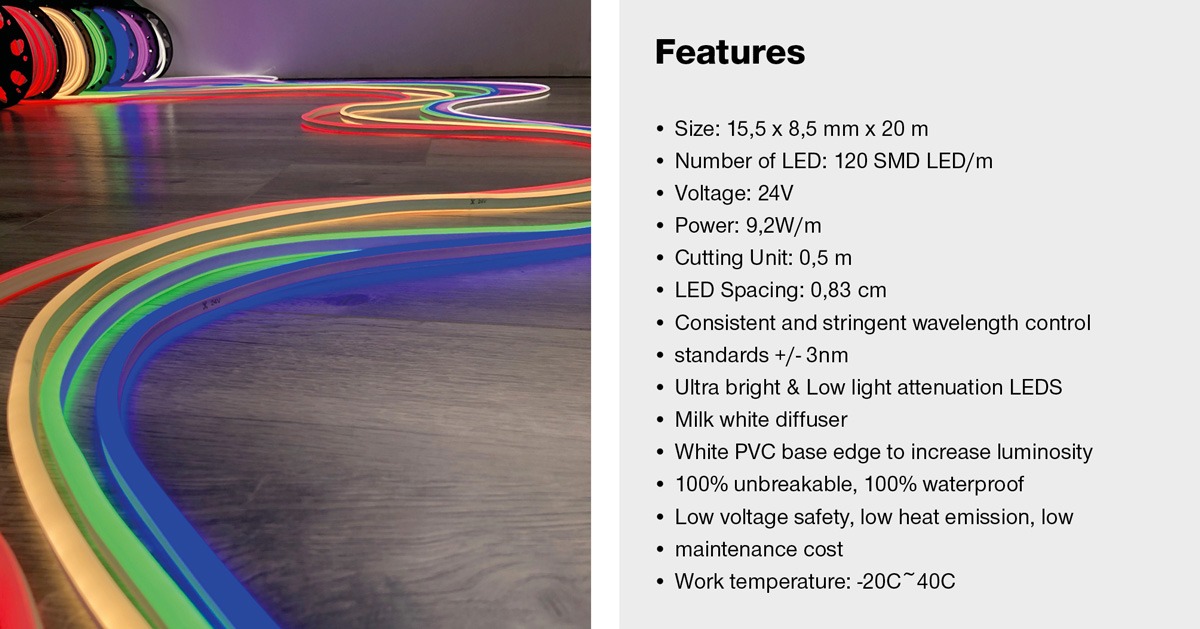 From shopping centres to shops and urban living spaces, Idolight LED Neon Flex is associated with modern and contemporary design. It is available in Red, Blue, Green, Pink, White and Warm White vivid colours.