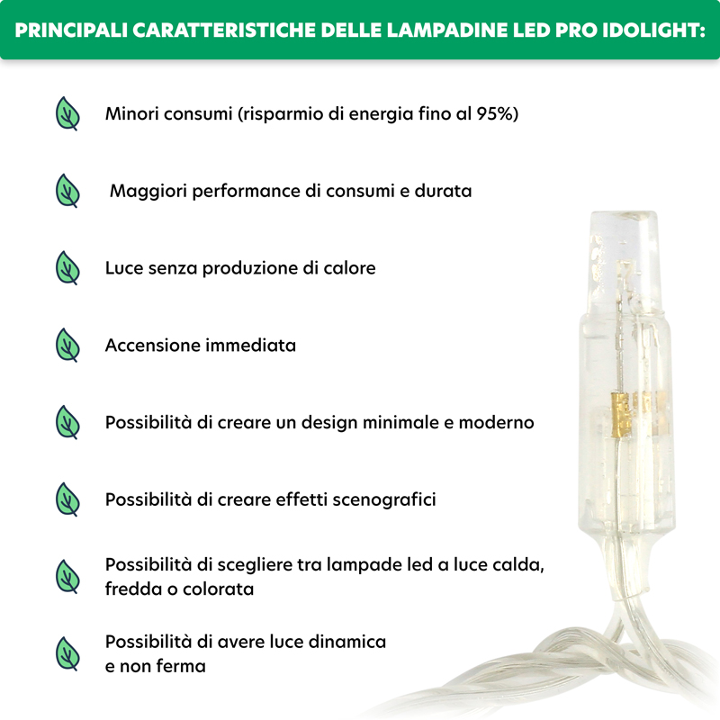 Rispondono esattamente all’esigenza di risparmio consentendo di tagliare i costi dell’energia e di utilizzarla nel pieno rispetto dell’ambiente. Le luci LED PRO Idolight hanno inoltre anche una durata molto maggiore rispetto alle altre.