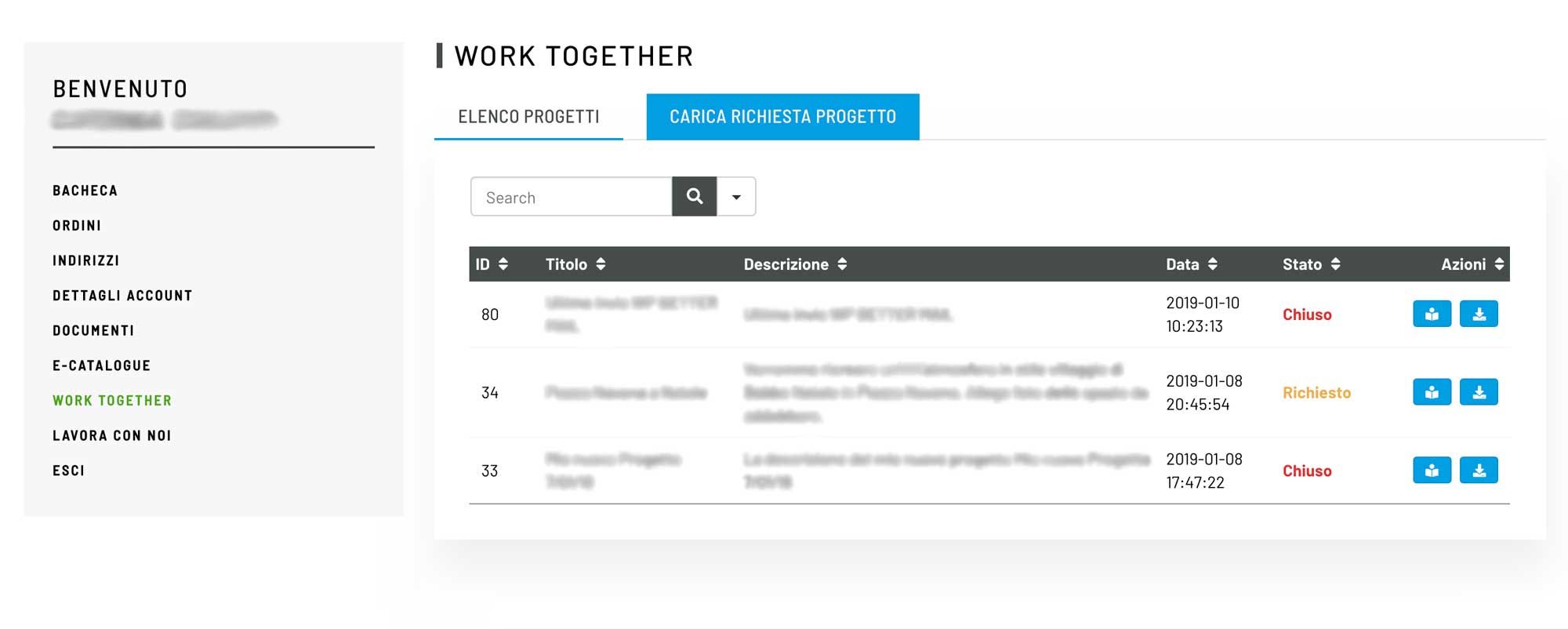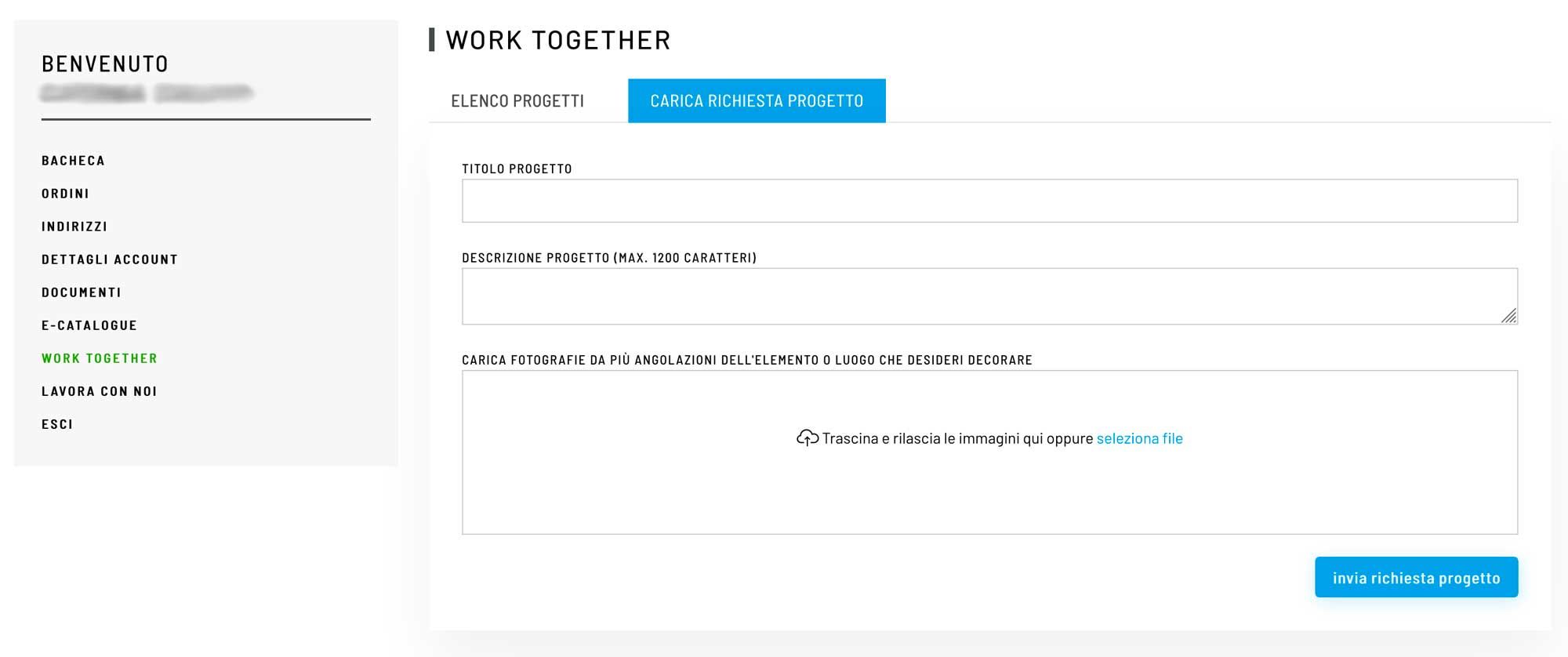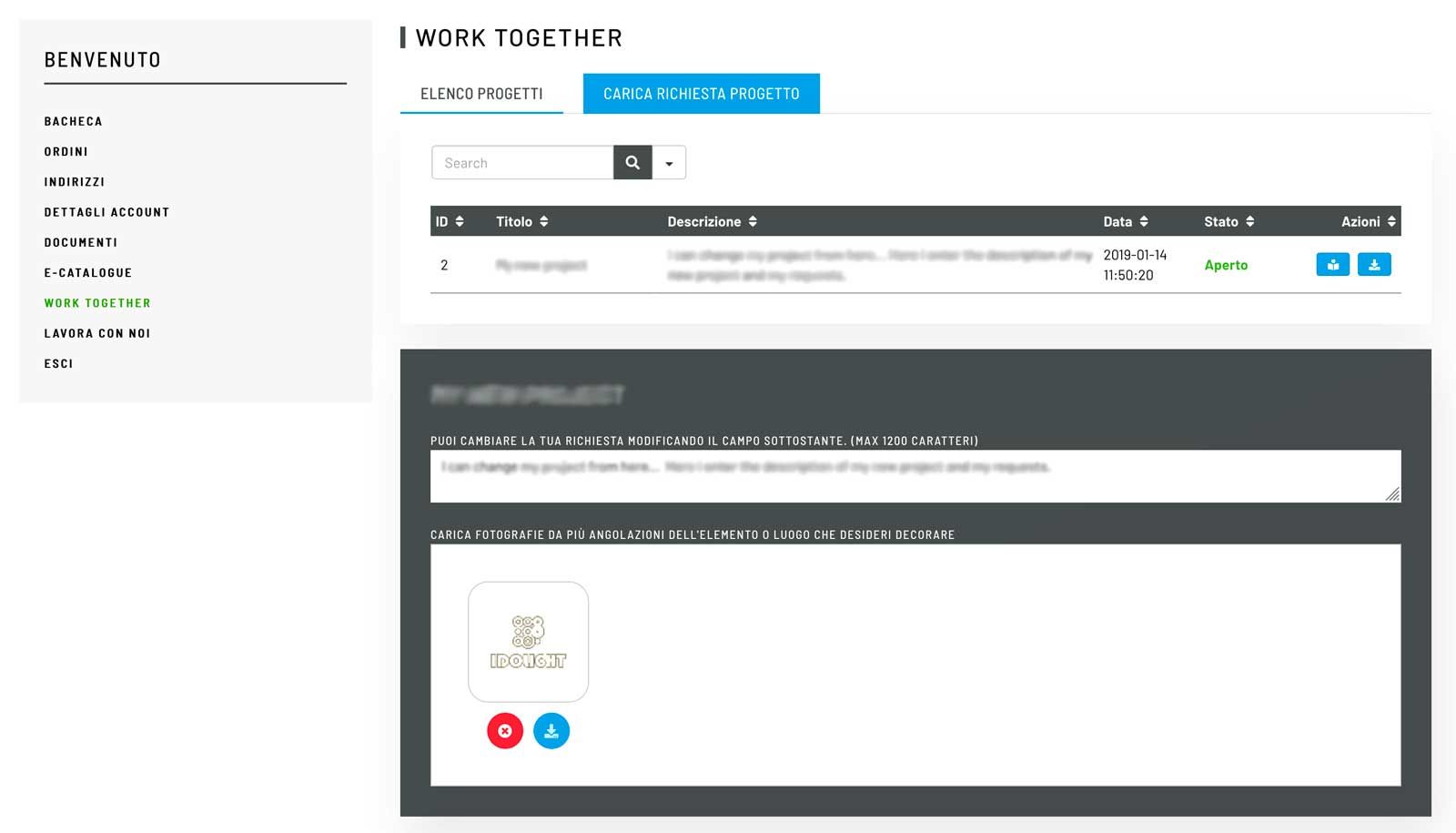 Dopo avere effettuato il Login entra nella sezione MyIdolight > Work Together e inserisci il tuo primo progetto cliccando su “Carica Richiesta Progetto”.