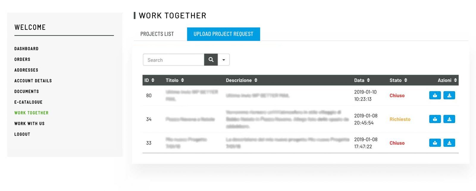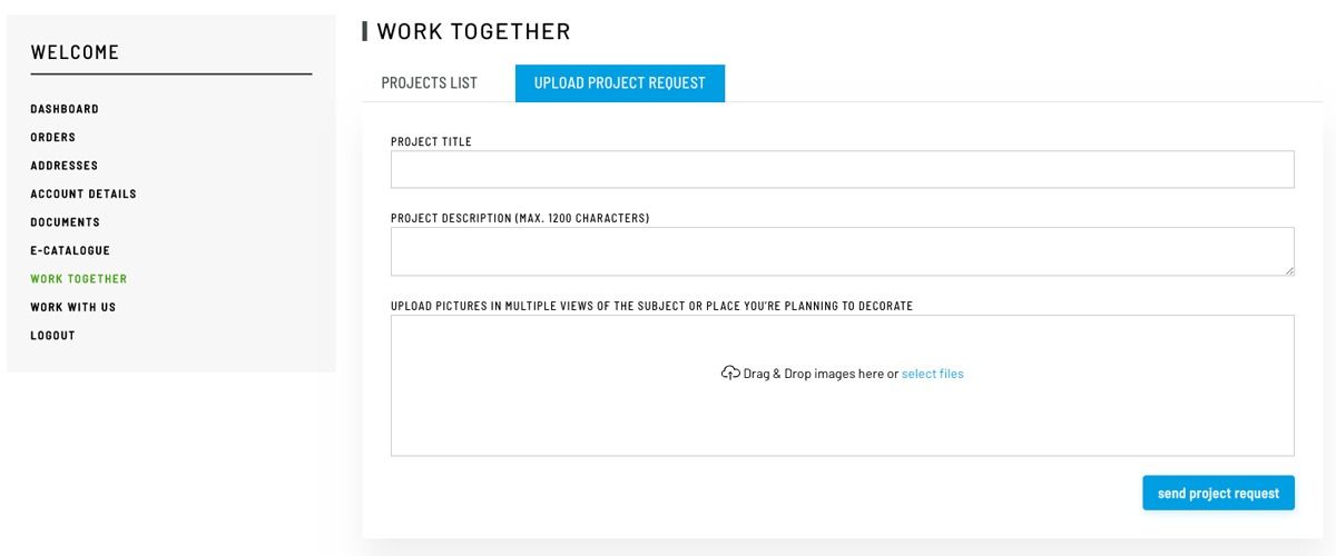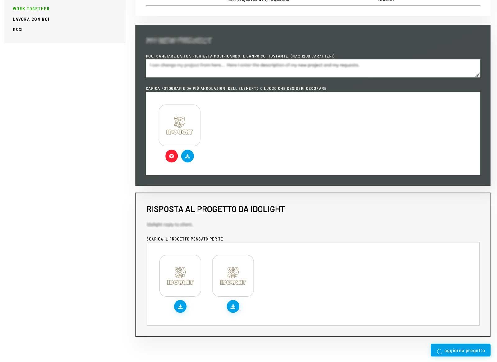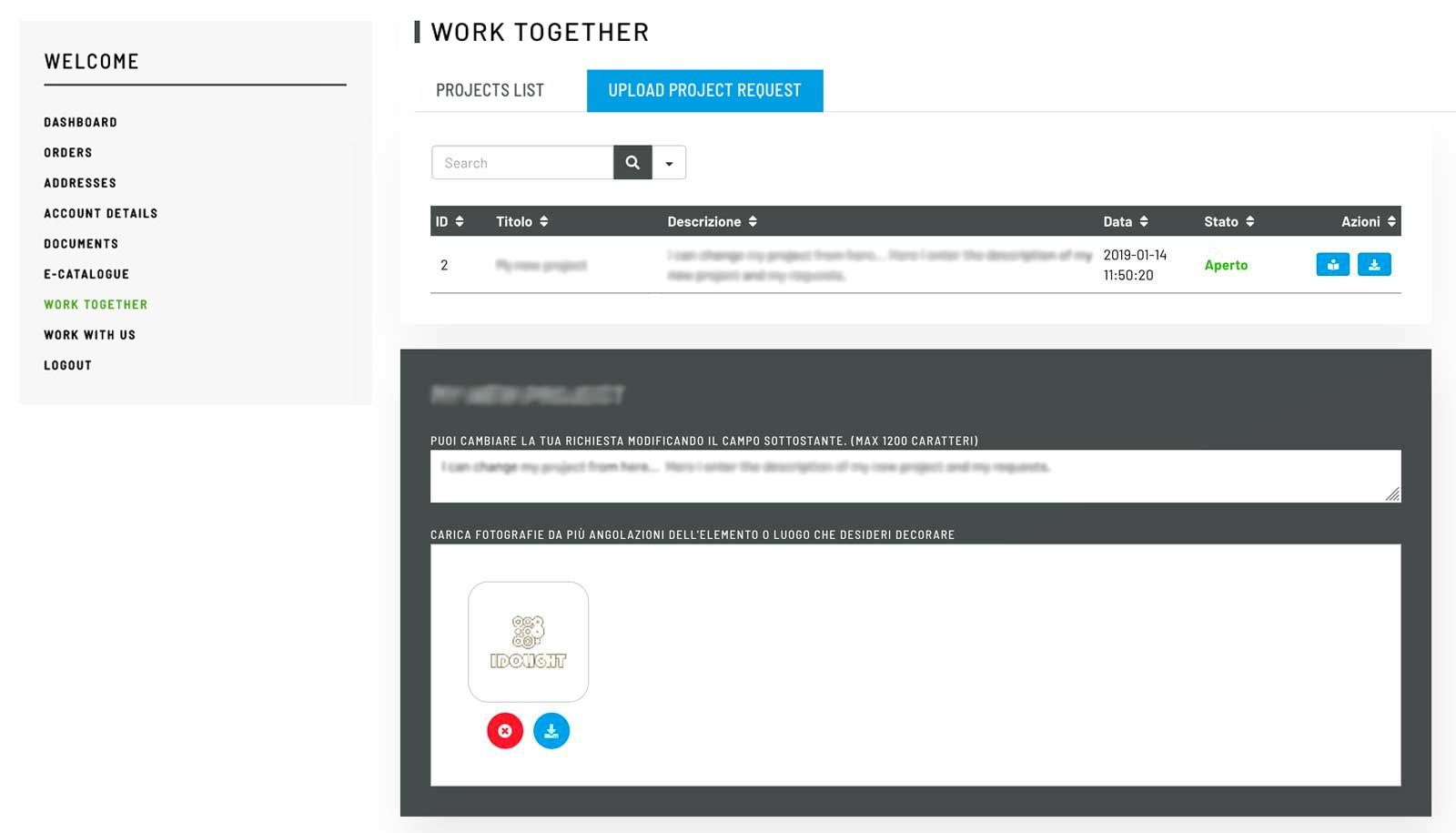 Access Work Together area after your log-in at MyIdolight > Work Together and upload your first project by clicking on “Upload Project Request”