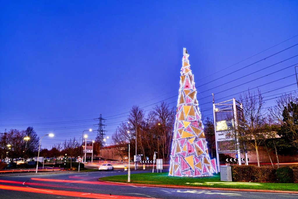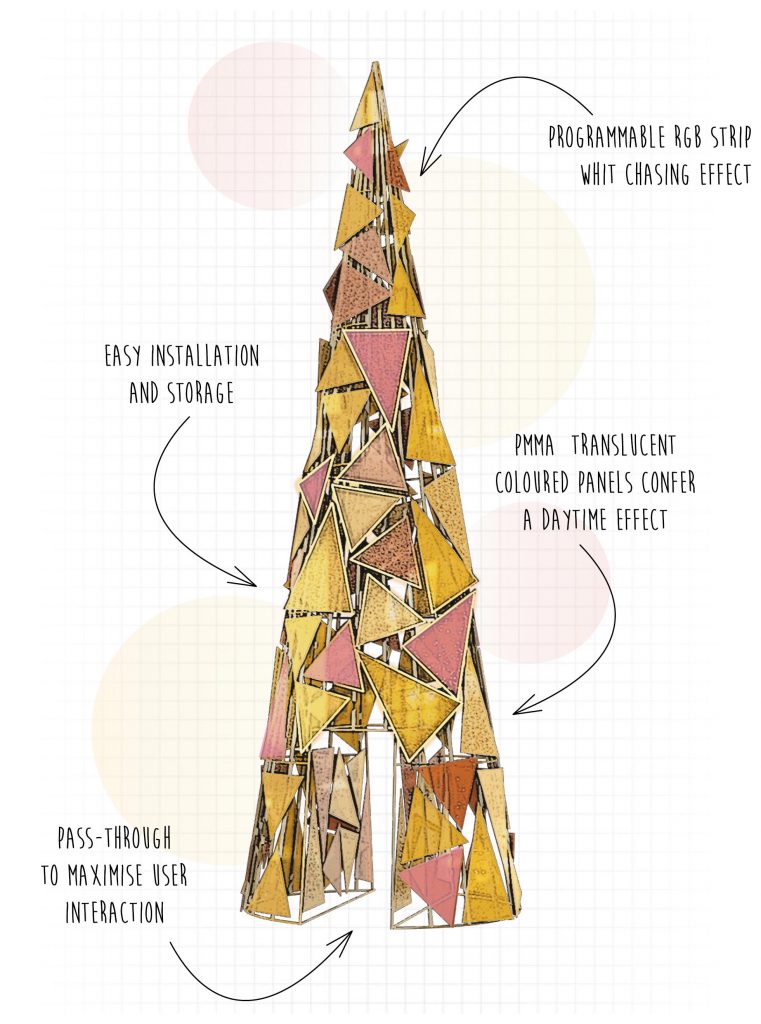 The simple conical shape, the traditional Christmas Tree’s archetype, is embellished by geometrical inserts which move up the silhouette: the PMMA translucent coloured panels confer a daytime effect to the tree, while allowing hundreds of full flashing LED fixed on the underneath structure, to shine through. Each edge is then further enriched by an outline of programmable RGB strip: the chasing effect chosen for this product becomes eye-catching, making the shopping experience always new and fascinating for the customer.